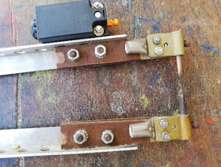 Con una varilla de cobre, de 0,5mm, preparamos los electrodos, puliendolos y dejando una punta mas o menos afilada como un lápiz. Con unas bisagras viejas de bronce, construimos los soportes de los electrodos. Estos se unen a los brazos mediante unas placas de baquelita. También se dejan preparadas las bornas. A uno de los brazos, le montamos un pulsador, para activar el soldador.